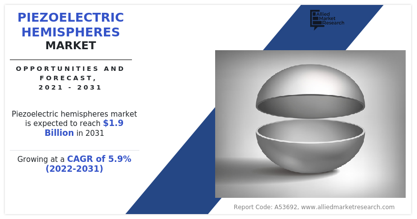 PORTLAND, OR, UNITED STATES, May 9, 2023 /EINPresswire.com/ -- According to the report by Allied Market Research, the global piezoelectric hemispheres market generated $1.0 billion in 2021, and is anticipated to generate $1.9 billion by 2031, witnessing a CAGR of 5.9% from 2022 to 2031. The report offers a detailed analysis of changing market trends, top segments, key investment pockets, value chains, regional landscapes, and competitive scenarios. The surge in demand for piezoelectric hemispheres in medical and industrial applications, a rise in the adoption of piezoelectric hemispheres in automotive industry, and rapid advancements in technology across various sectors drive the global piezoelectric hemispheres market. Moreover, the rise in demand for non-invasive medical imaging and diagnostics is anticipated to provide lucrative opportunities in the coming years.