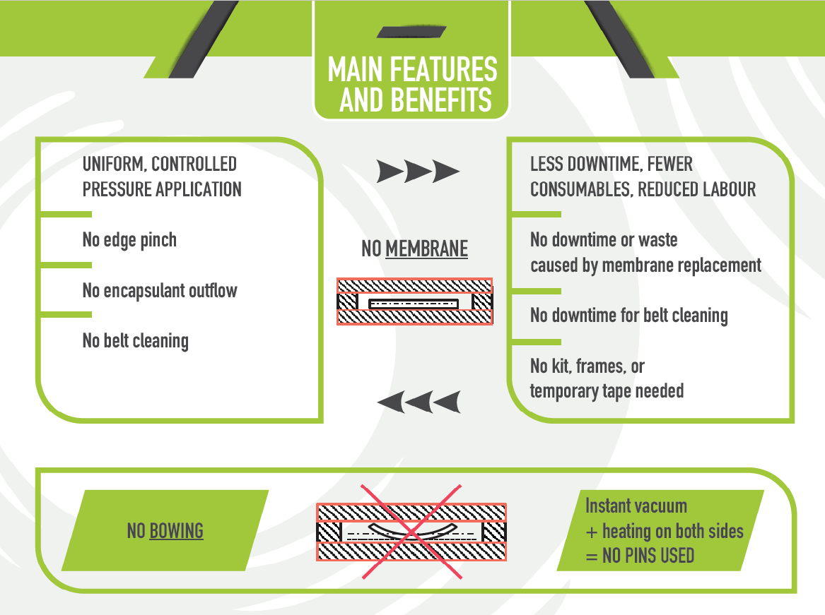 The Robostak is entirely made in Italy using European quality materials and compliant with ISO9001. It is a patented high-capacity diaphragm-free laminator with an innovative multistage crosslinking section. With no silicone membrane to change, Robostak greatly reduces downtime and it is also able to solve problems regarding the encapsulant outflow and belt cleaning by eliminating the edge-pinch.