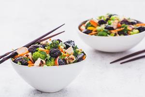Though prunes are often associated with snacking or baked goods, their sweet, earthy taste and chewy sticky texture make them a great complement to savoury meat dishes and a key component in sauces and dressings. For an easy, fresh, and flavourful meal try California Prunes’ Zesty Asian Chicken Salad. Prunes from California have natural sugars that make them tender when cooked, which also gives a distinct texture to the dish. The coconut aminos in this dish give the flavour of soy without the gluten. Ginger and garlic provide a zesty kick while sweetness from California Prunes ties the entire salad together.