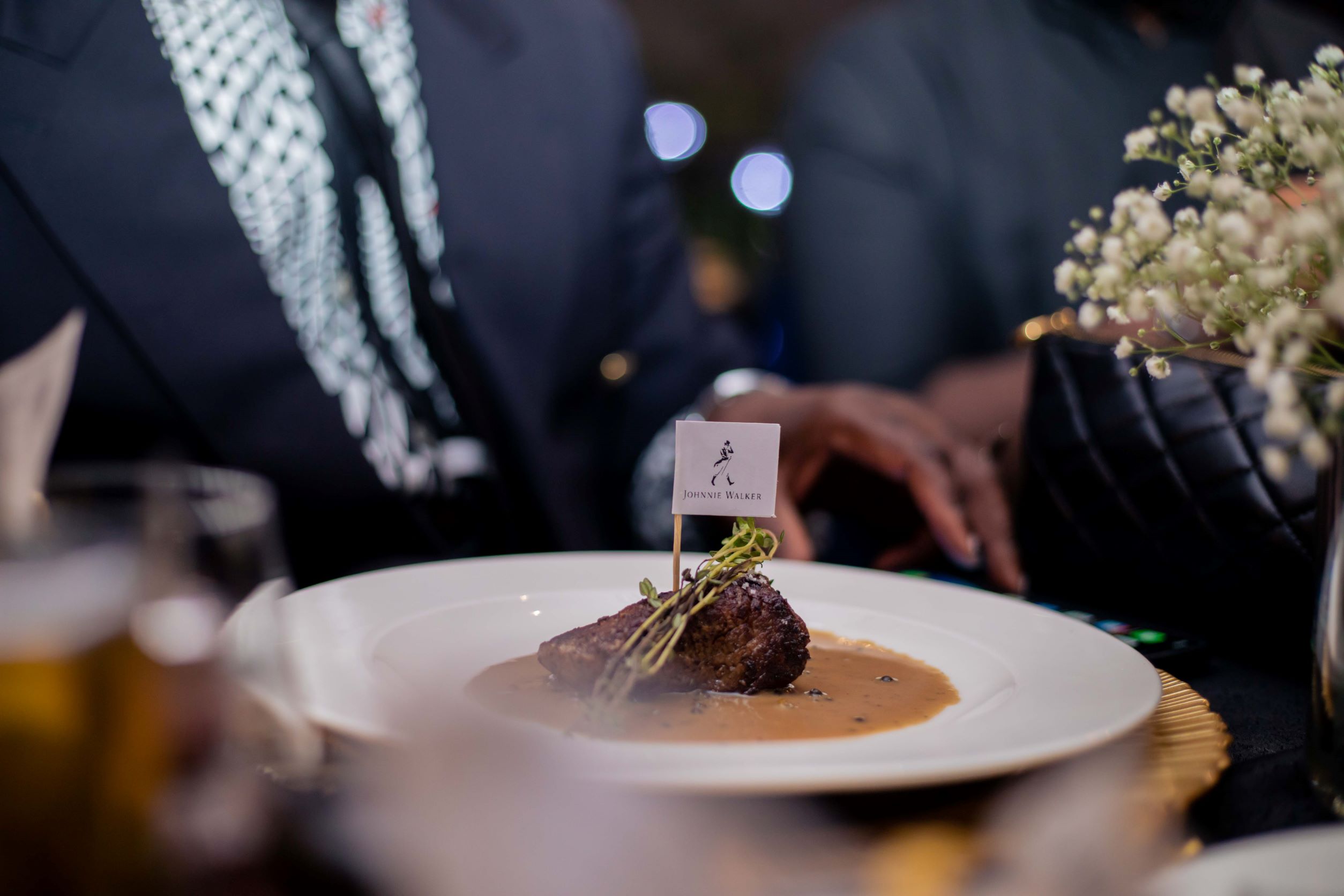 Le dîner était agrémenté d'une élégante décoration noire et or, avec le chef Axel Rousseau qui présentait un menu raffiné. Outre les cocktails Johnnie Walker Gold Label Reserve, les convives ont pu savourer du Johnnie Walker Blue Label en guise de dessert.