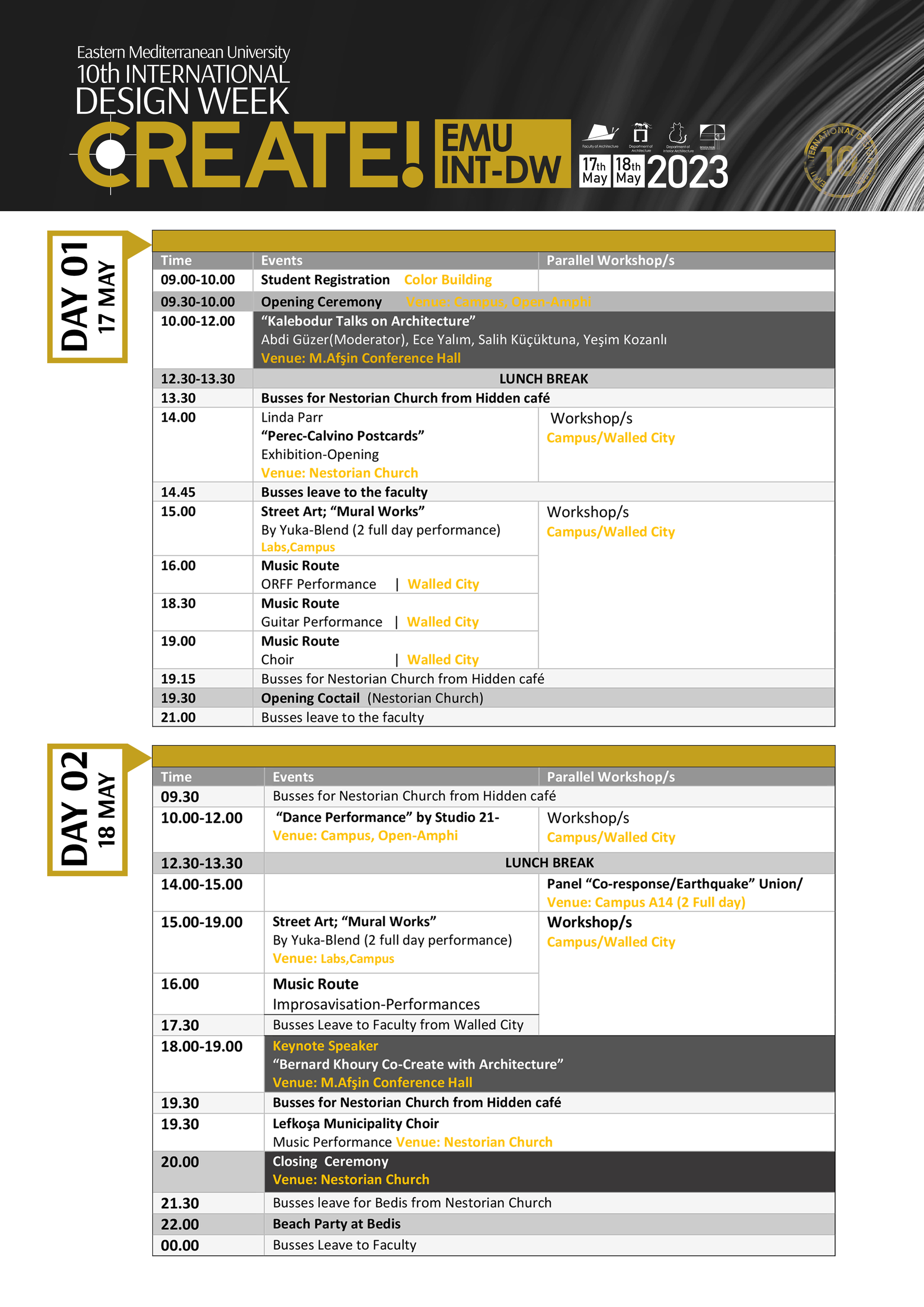 On Thursday, 18 May, 2023, the second day of the 10th EMU International Design Week, a panel titled “Create Together-Impact/Earthquake” will be held. The said panel, to be held in cooperation with the Cyprus Turkish Union of Chambers of Engineers and Architects (KTMMOB) will take place at EMU Architecture Faculty with participants from various sectors such as the central government, relevant departments, municipalities, academics and sector representatives. The panel proceedings will make an important contribution to the creation of a common voice.