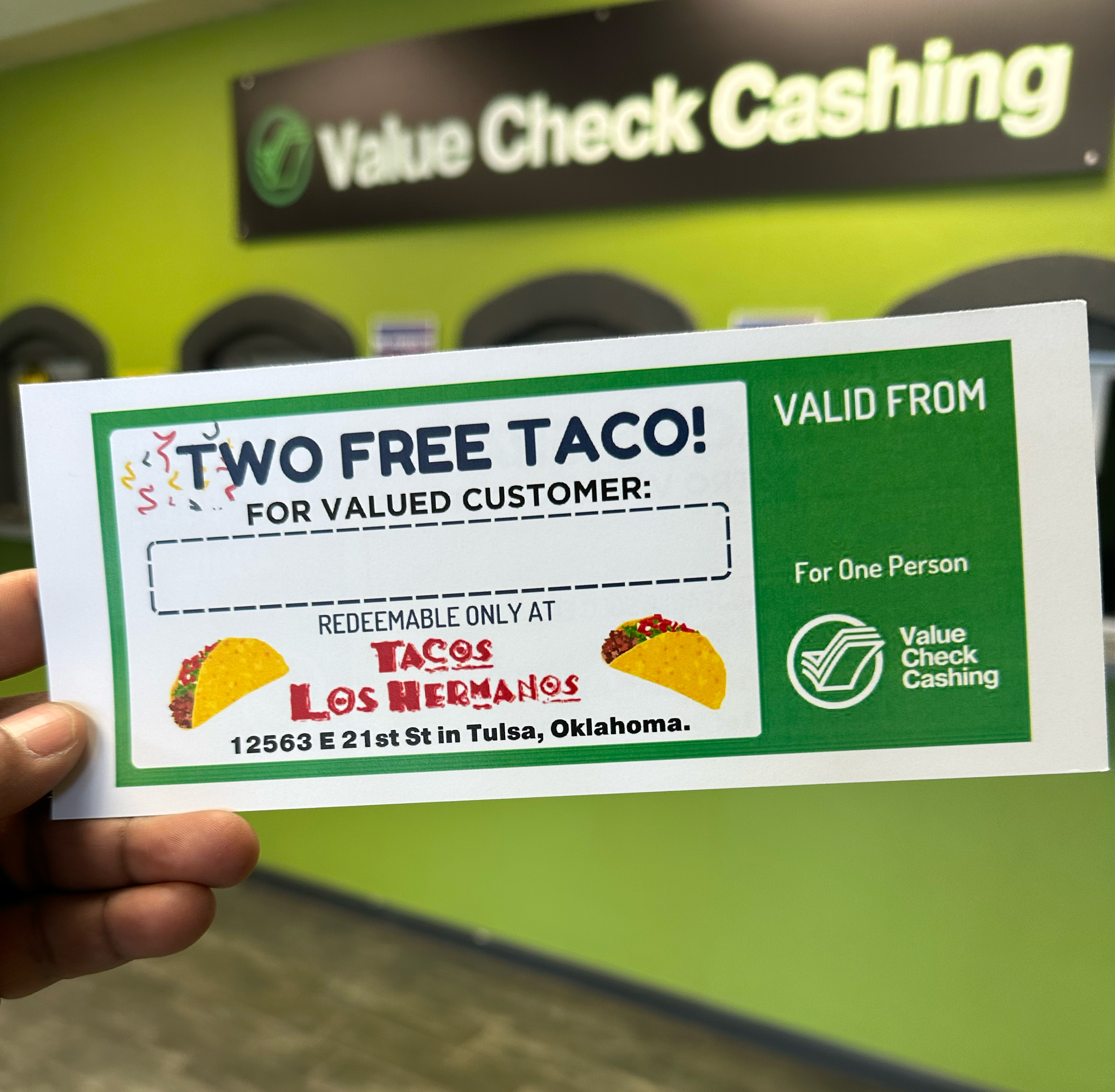 Value Check Cashing invites the Tulsa community to take advantage of this special promotion every Tuesday. After cashing a check, customers can cross the street to Tacos Los Hermanos and enjoy two free tacos as a thank you for supporting local businesses.