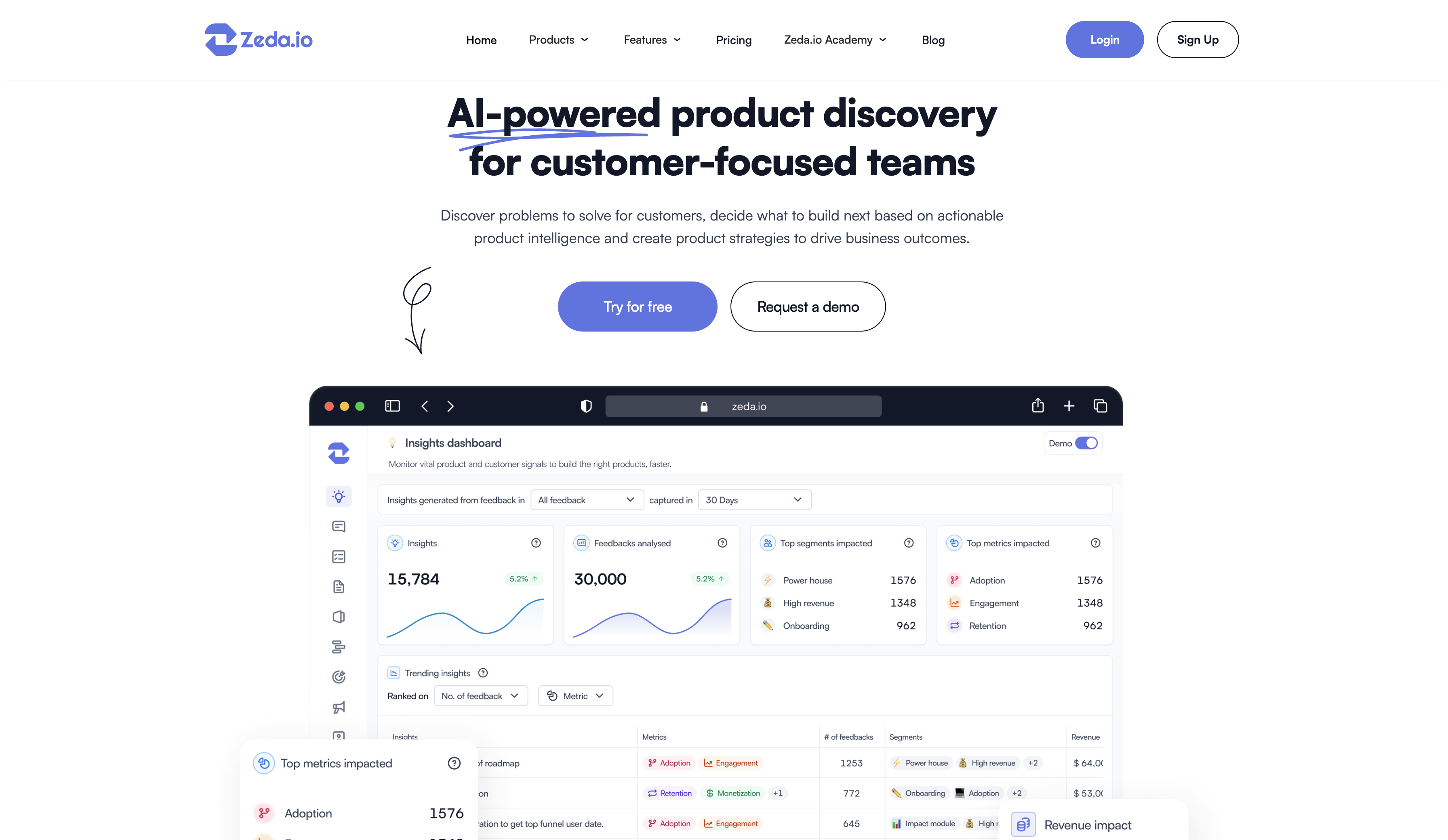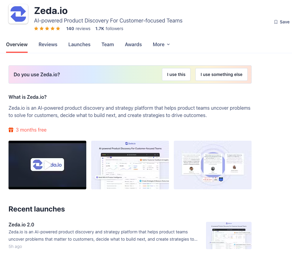 Zeda.io is an AI-powered product discovery and strategy platform that helps product teams uncover problems that matter to customers, decide what to build next, and create strategies to drive outcomes.
