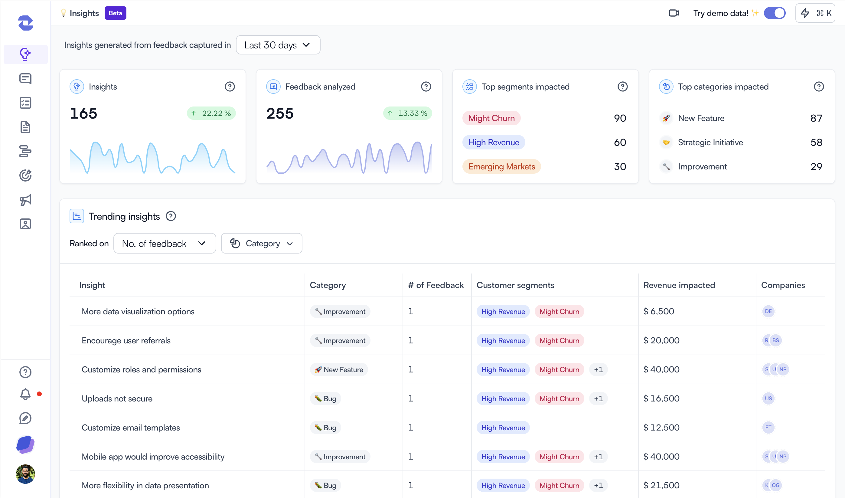 1. Customer Insights: Centralize customer and product feedback, uncover critical issues, and discover product opportunities to assess their revenue impact.