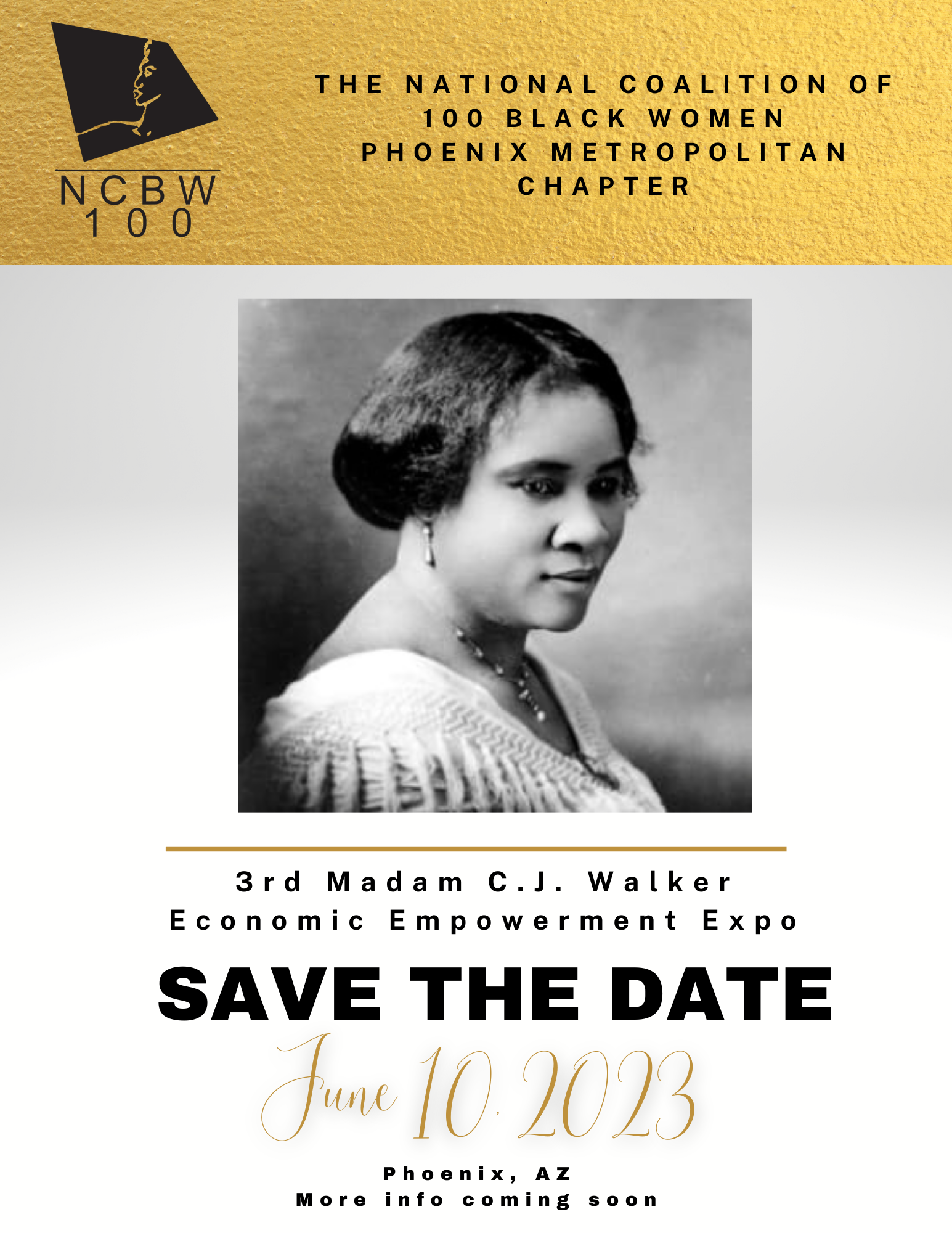 PHOENIX, AZ, USA, May 23, 2023/EINPresswire.com/ -- The National Coalition of 100 Black Women, Inc., Phoenix Metropolitan Chapter (“NCBW Phoenix”), is proud to announce the 2023 Madam C.J. Walker Economic Empowerment Expo and Luncheon to be held at the Arizona Broadway Theatre, 7701 W Paradise Ln, Peoria, AZ 85382, on Saturday, June 10, 2023, from 10am to 3pm Arizona time.Paying homage to the life and legacy of the first self-made millionairess Madam C.J. Walker, the 2023 Economic Empowerment Expo celebrates Black women-owned businesses and offers mini empowerment sessions designed to: