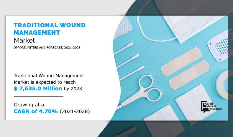 PORTLAND, OREGON, UNITED STATES, May 24, 2023 /EINPresswire.com/ -- Traditional wound management has long been a fundamental approach to treating various types of wounds. This method involves the use of basic wound care principles, such as cleaning the wound with sterile solutions, applying dressings, and ensuring proper wound healing. Traditional wound management techniques focus on promoting wound closure, preventing infection, and minimizing complications. Simple dressings, such as gauze pads or adhesive bandages, are commonly used to cover and protect the wound, creating a barrier against external contaminants. The global traditional wound management market was valued at $5,247.9 million in 2020 and is projected to reach $7,635.0 million by 2028 registering a CAGR of 4.70% from 2021 to 2028.