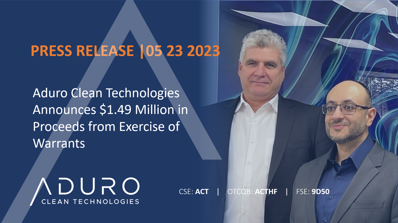 SARNIA, Ontario, May 29, 2023 (GLOBE NEWSWIRE) -- Aduro Clean Technologies Inc. („Aduro“ oder das „Unternehmen“) (CSE: ACT) (OTCQB: ACTHF) (FSE: 9D50), ein kanadisches Technologieunternehmen, das die Kraft der Chemie nutzt, um geringerwertige Rohmaterialien wie Kunststoffabfälle, Bitumen und erneuerbare Öle in Ressourcen des 21. Jahrhunderts umzuwandeln, freut sich, die erfolgreiche Ausübung von Optionsscheinen durch seine Aktionäre bekannt zu geben.