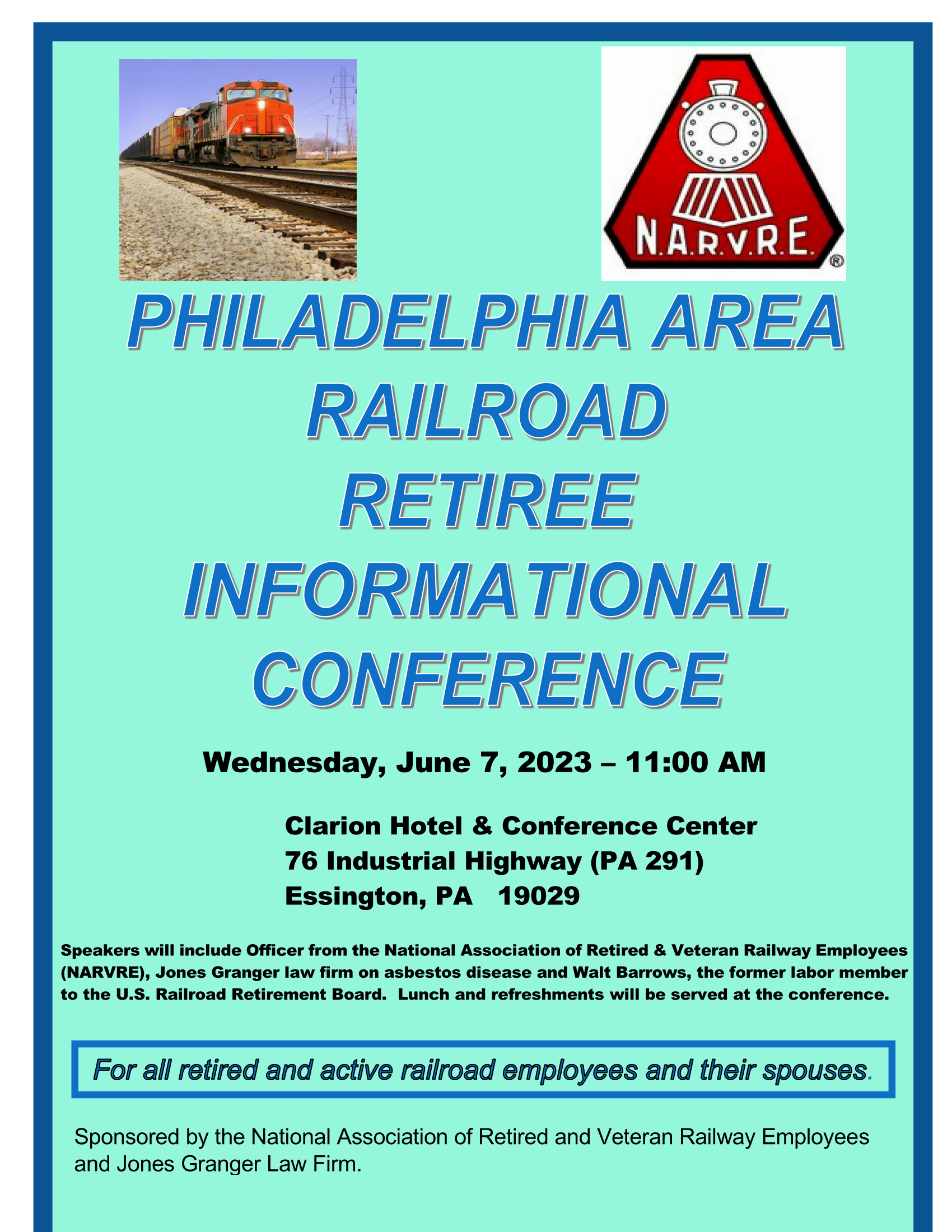 On Wednesday, June 7, 2023, the National Association of Retired & Veteran Railway Employees, Inc. (NARVRE), will be holding Railroad Retiree Informational Conference. The conference will be held at the Clarion Hotel & Conference Center located at 76 Industrial Highway (PA 291) in Essington, PA, beginning at 11:00 AM.