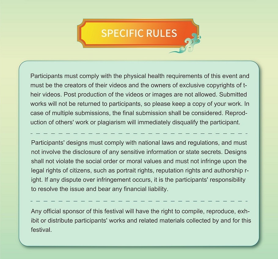 Participants' designs must comply with national laws and regulations, and must not involve the disclosure of any sensitive information or state secrets. Designs shall not violate the social order or moral values and must not infringe upon the legal rights of citizens, such as portrait rights, reputation rights and authorship right. If any dispute over infringement occurs, it is the participants' responsibility to resolve the issue and bear any financial liability.