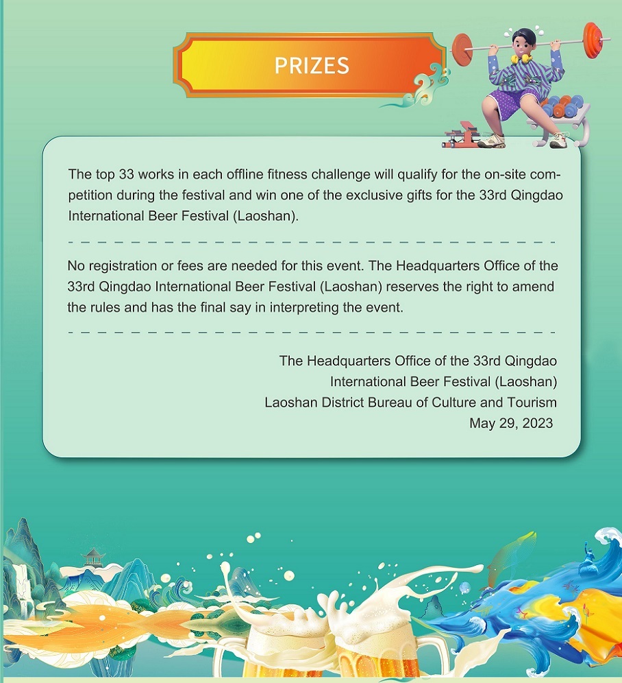 The top 33 works in each offline fitness challenge will qualify for the on-site competition during the festival and win one of the exclusive gifts for the 33rd Qingdao International Beer Festival (Laoshan).