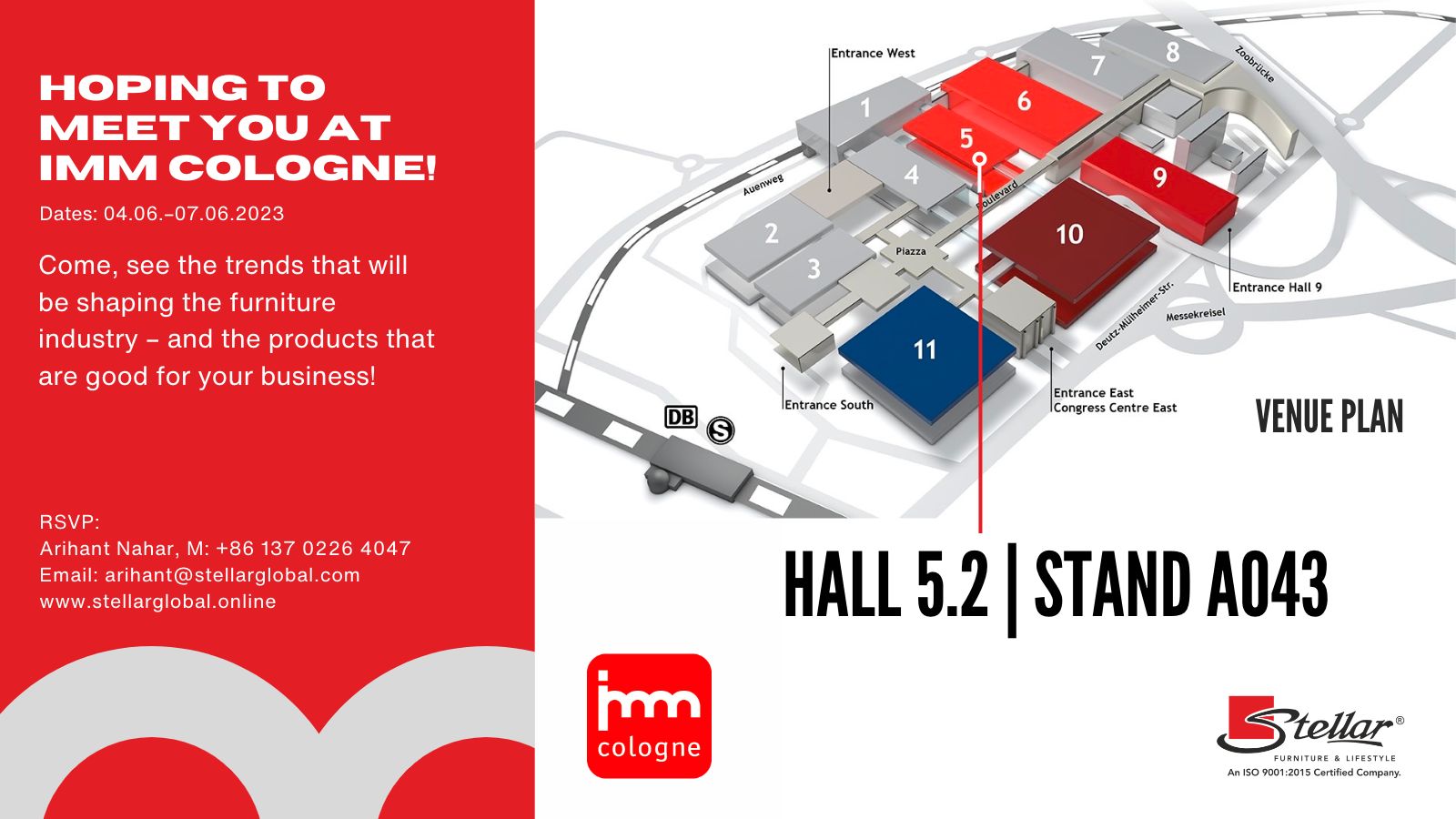 Um die neuesten High-Tech-Bürostühle und erstklassigen Möbelprodukte von Stellar zu erleben, besuchen Sie die Ausstellung in Halle 5.2, Stand A043 während der imm Cologne 2023, die vom 4. bis 7. Juni stattfindet. Lassen Sie sich von der Verschmelzung von Innovation, Funktionalität und ästhetischer Anziehungskraft begeistern, die Stellar's Angebote auszeichnet.