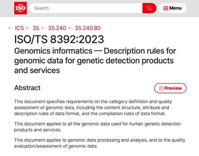 SHENZHEN, CHINA, June 2, 2023/EINPresswire.com/ -- Die internationale Norm "ISO/TS 8392:2023 Genomics informatics - Description rules for genomic data for genetic detection products and services" wurde kürzlich offiziell veröffentlicht. Diese Norm ist die weltweit erste internationale Norm, die Anforderungen an die Kategorisierung und Qualitätsbewertung genomischer Daten festlegt, einschließlich der inhaltlichen Struktur, der Attribut- und Beschreibungsregeln des Datenformats und der Kompilierungsregeln des Datenformats.Dieser Standard wurde gemeinsam von BGI-Research und dem China National Institute of Standardization vorgeschlagen und vom Technischen Komitee für Gesundheitsinformatik (ISO/TC 215) der Internationalen Organisation für Normung (ISO) entwickelt. Mit der raschen Entwicklung der Genomikindustrie und der rapiden Kostensenkung bei der Gensequenzierung werden immer mehr Genomdaten erzeugt. Die Qualität dieser Daten ist jedoch oft nicht optimal, z. B. unzureichende Vollständigkeit und semantische Inkonsistenz der medizinischen Informationen, was die Speicherung, den Austausch, die gemeinsame Nutzung, die Anwendung und die Industrialisierung von Genomdaten ernsthaft behindert. Daher ist die Standardisierung von Genomdaten eine Voraussetzung für ihre effiziente Verwaltung als Vermögenswert.