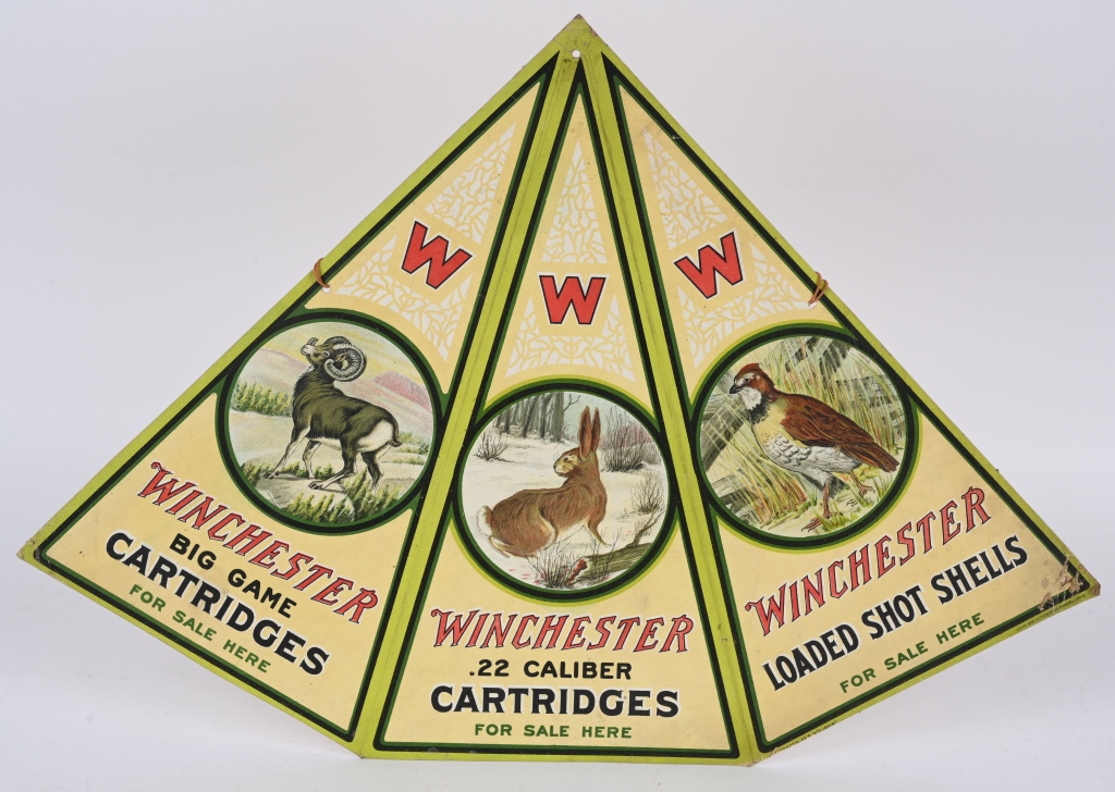 The most artful signage of the golden age of advertising was commissioned by manufacturers of tobacco, alcoholic beverages, and sporting arms. Dozens of fine examples of the latter category will be auctioned on June 10. Leading the group is a very rare and colorfully pictorial circa-1909 Winchester pyramid-form hanging sign advertising cartridges and shot shells, which is estimated at $5,000-$8,000.