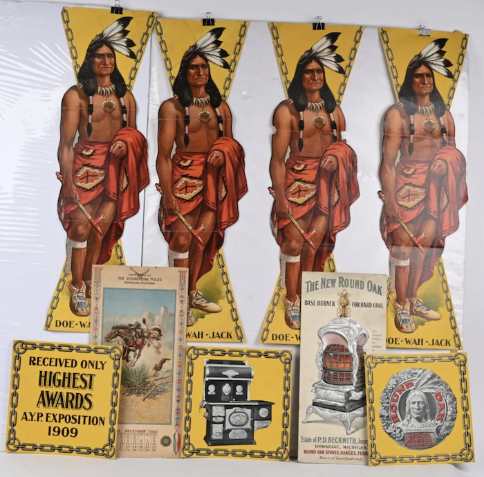 There’s a group lot of five 1920s signs advertising Nicholson Files, a product which would have been highly important to mechanics in America’s exploding automobile industry. The tri-fold die-cuts are offered with a $500-$700 estimate.
