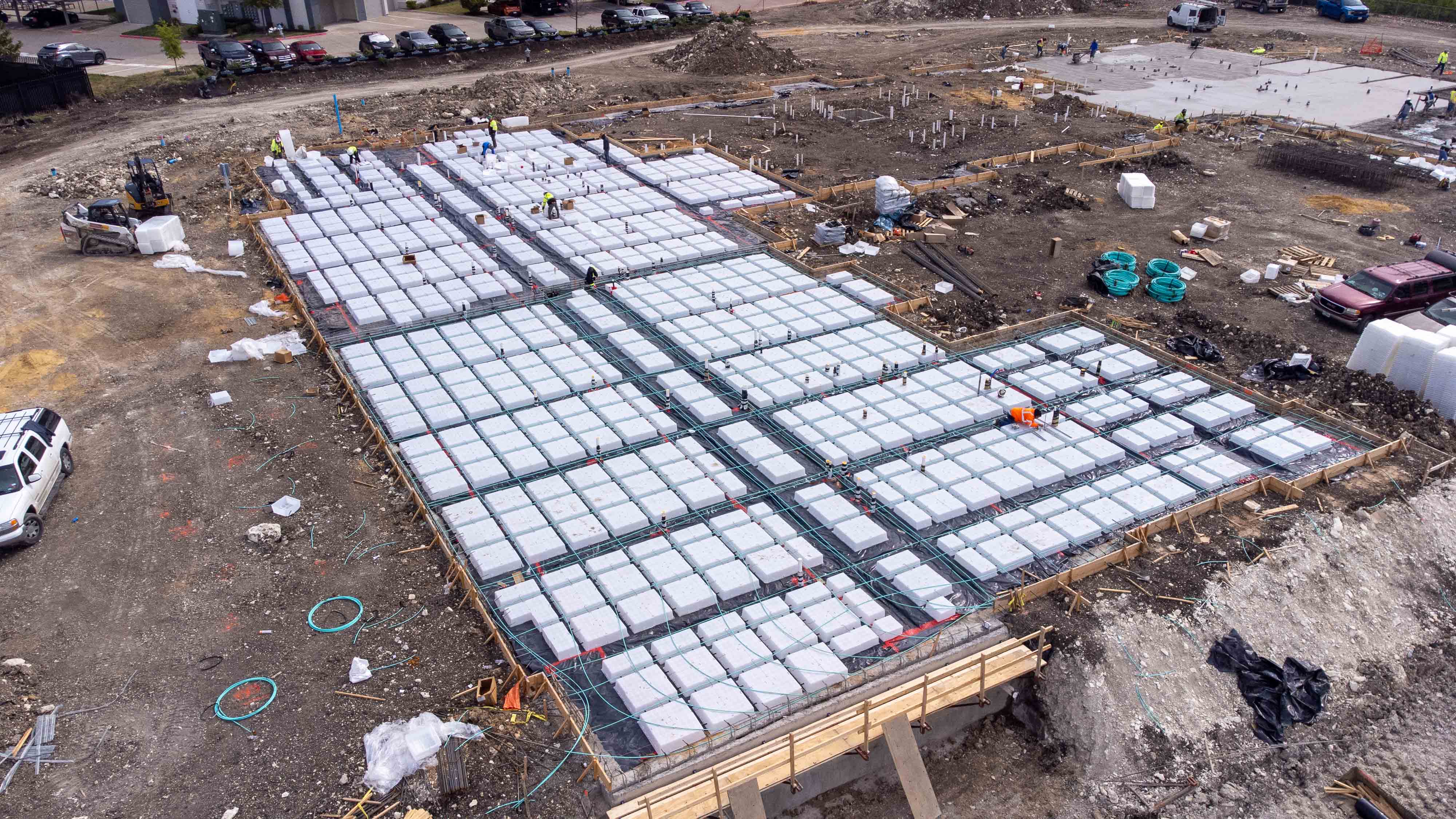 The Wafflemat foundation system is a two-way concrete slab foundation design that allows for a stiffer slab design. The Wafflemat system provides superior strength and stability over traditional slab-on-grade foundations. Additionally, the Wafflemat design creates an insulating air gap beneath the foundation, which helps to regulate temperature and improve energy efficiency. Additionally, it allows expansive soils room to expand without coming into contact with the slab. By utilizing the Wafflemat foundation system, the apartment building in Firewheel will be more durable, energy-efficient, and environmentally friendly.
