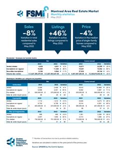 L’ÎLE-DES-SŒURS, Quebec, June 05, 2023 (GLOBE NEWSWIRE) -- The Quebec Professional Association of Real Estate Brokers (QPAREB) has just released its residential real estate market statistics for the month of May 2023. The most recent market statistics for the Montreal Census Metropolitan Area (CMA) are based on the real estate brokers’ Centris provincial database.