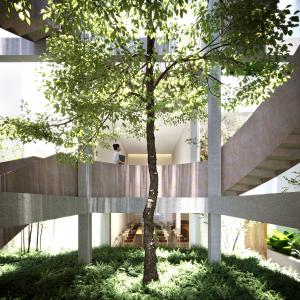 In order to introduce natural lighting into the building, the proposal suggests demolishing the existing staircase and partial floor slab at the center of the building to create an atrium with a skylight above. This will illuminate the darkest recesses of the building. Additionally, a curved metal staircase is proposed at the atrium to replace the existing staircase, strategically placed around a central green courtyard. Moreover, the same strategy is applied to the back side of the building, allowing natural light to enter from both the front and back facades, as well as the rooftop.