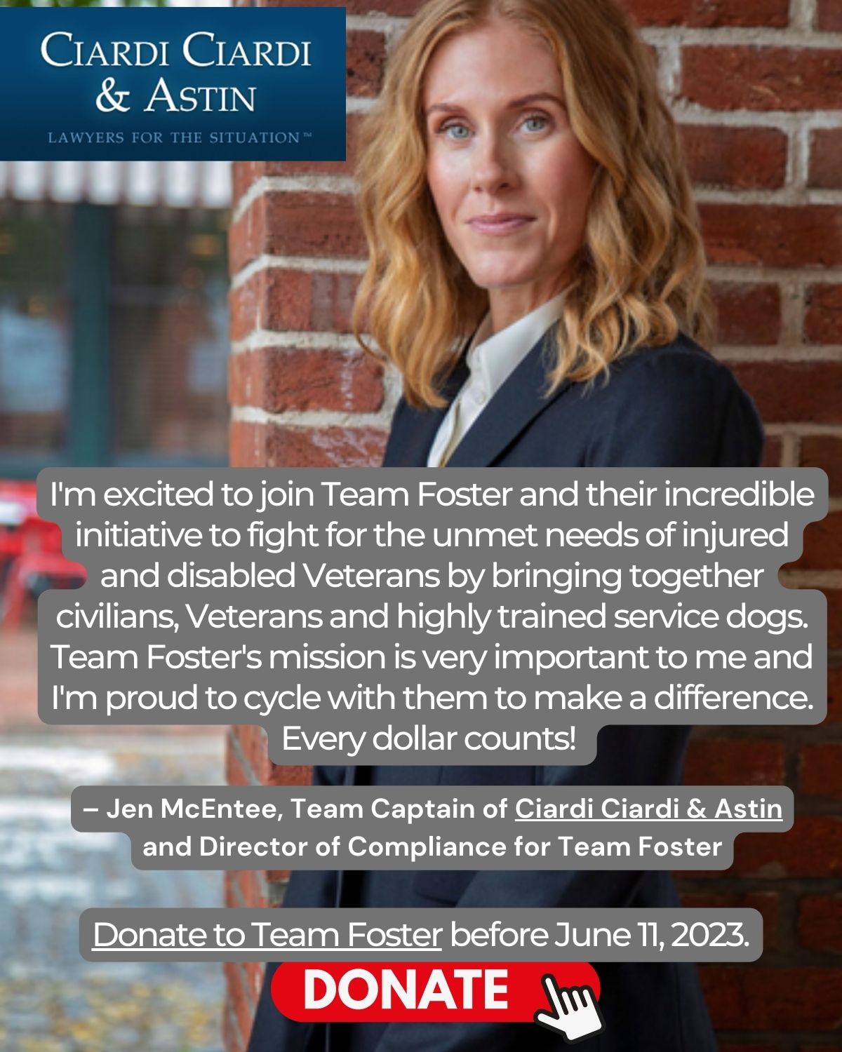"We are thrilled to collaborate with Team Foster on this important initiative," said Jen McEntee, Team Captain of Ciardi Ciardi & Astin and Director of Compliance for Team Foster. “I'm excited to join Team Foster and their incredible initiative to fight for the unmet needs of injured and disabled Veterans by bringing together civilians, Veterans, and highly trained service dogs. Team Foster's mission is very important to me, and I'm proud to cycle with them to make a difference. Every dollar counts! Donate here https://charity.pledgeit.org/t/ddZo9IdseZ.”