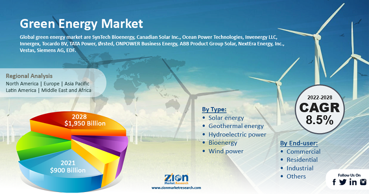 Demand for Global Green Energy Market Size to Surpass USD 1950 Billion by 2028, Exhibit a CAGR of 8.5% | Green Energy Industry Trends, Share, Price, Growth, Leaders, Analysis & Forecast Report by Zion Market Research