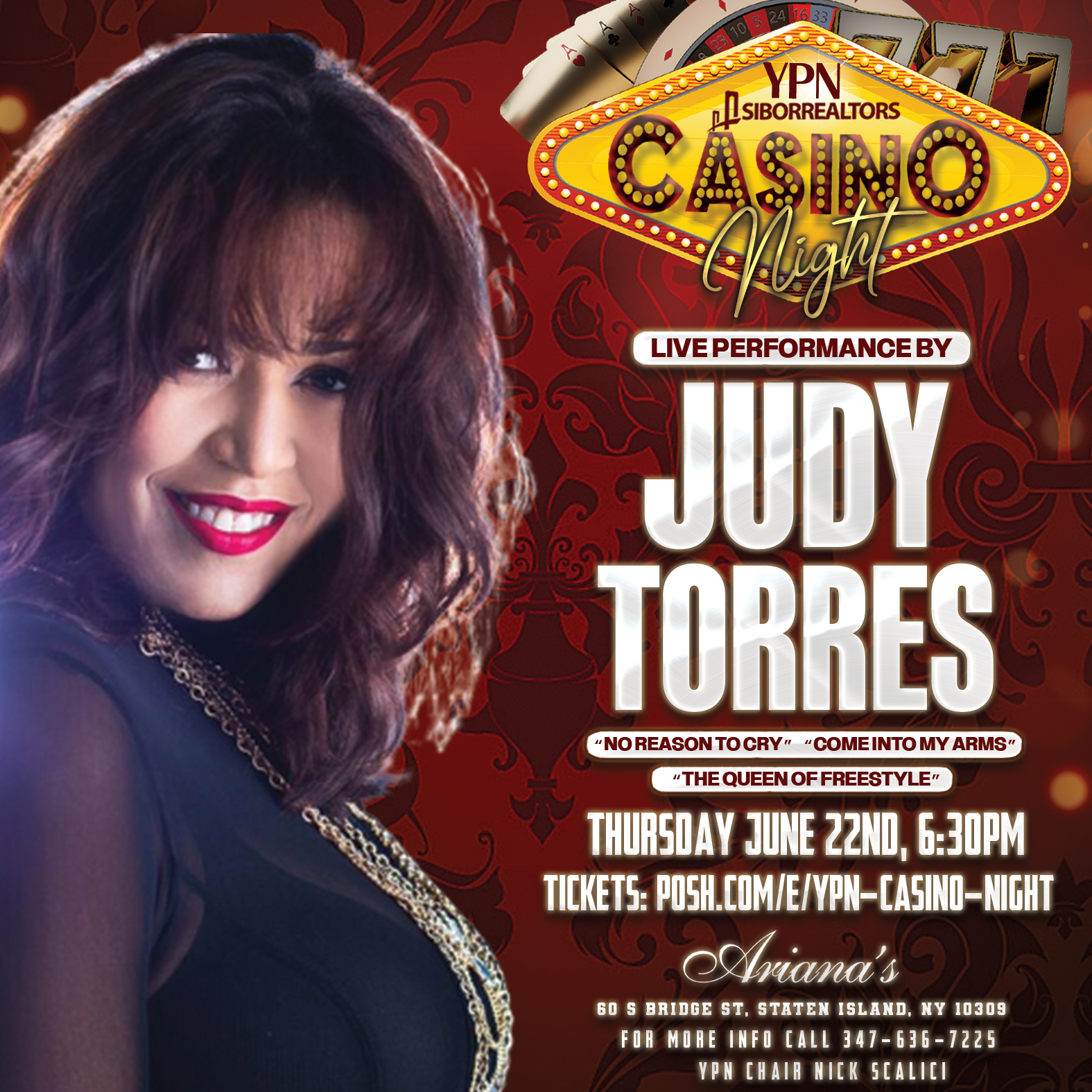 STATEN ISLAND, NY, UNITED STATES, June 9, 2023/EINPresswire.com/ -- The public is invited to join in the fun when the Young Professionals Network (YPN) of the Staten Island Board of Realtors® (SIBOR) presents its Casino Night featuring recording artist, actress and entertainer Judy Torres, the legendary “Queen of Freestyle.”The event is set for Thursday, June 22, at Ariana's South; 60 South Bridge Street, Richmond Valley. Doors open at 6:30 p.m.