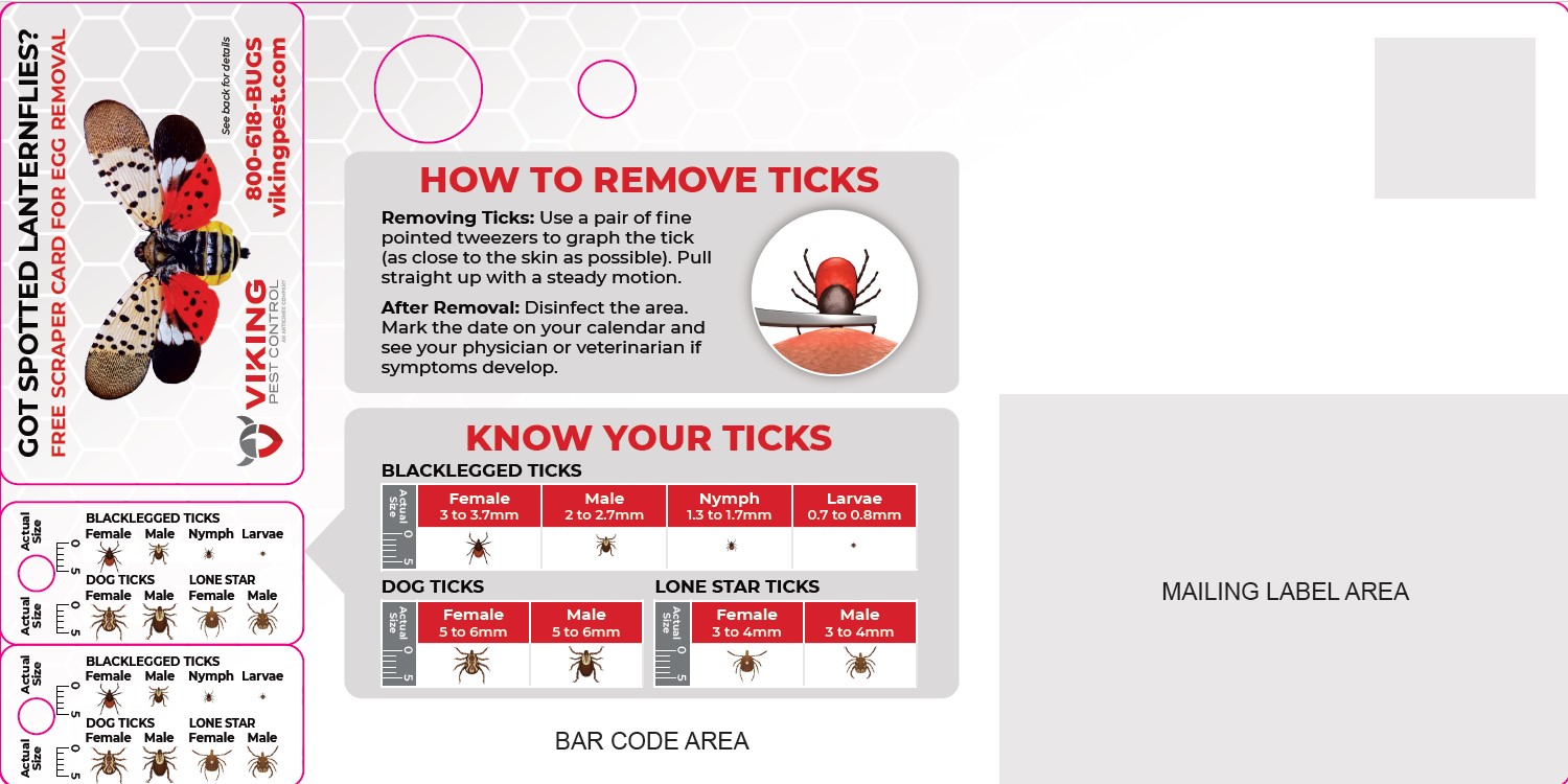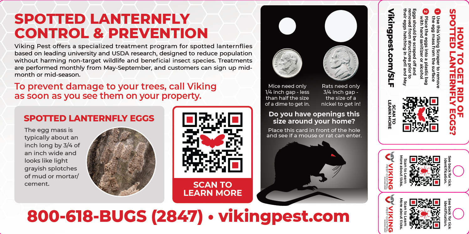 In addition to practical advice, Viking is releasing an updated variation of its popular Spotted Lanternfly Egg Scraper cards, this time including a keychain tag that illustrates the size and appearance of the ticks most seen in New Jersey, Pennsylvania, Delaware, and Maryland. Ticks can be surprisingly small, some no bigger than a poppy seed, so knowing what to look for is essential. The revised scraper cards also include two holes demonstrating the smallest space mice and rats can squeeze through.