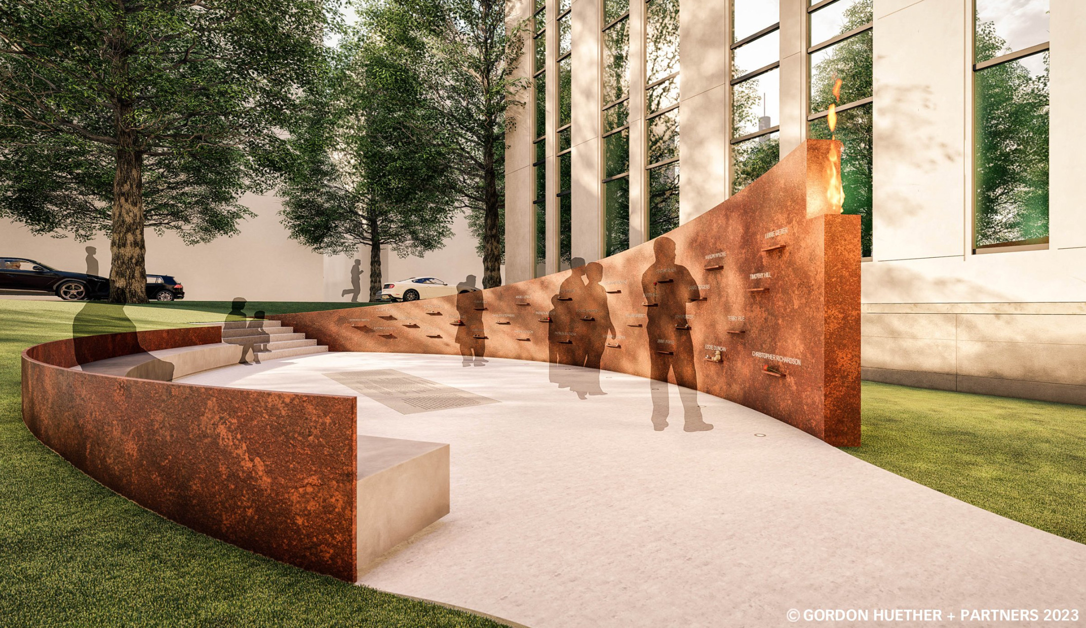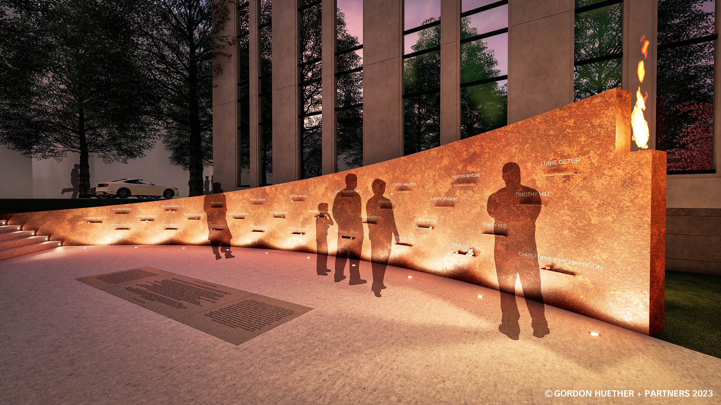 The Eternal Flame memorial by international artist Gordon Huether of Napa, CA, includes a 55-foot-long remembrance wall with the name of each victim mounted next to an accompanying shelf for mourners to place special mementos in honor of a child lost too soon. Seating faces the expansive wall, where visitors can spend time, contemplate, and pay their respects. The wall’s composition of Corten steel gives the memorial a strong, enduring impact as it weathers into a rust-colored patina.