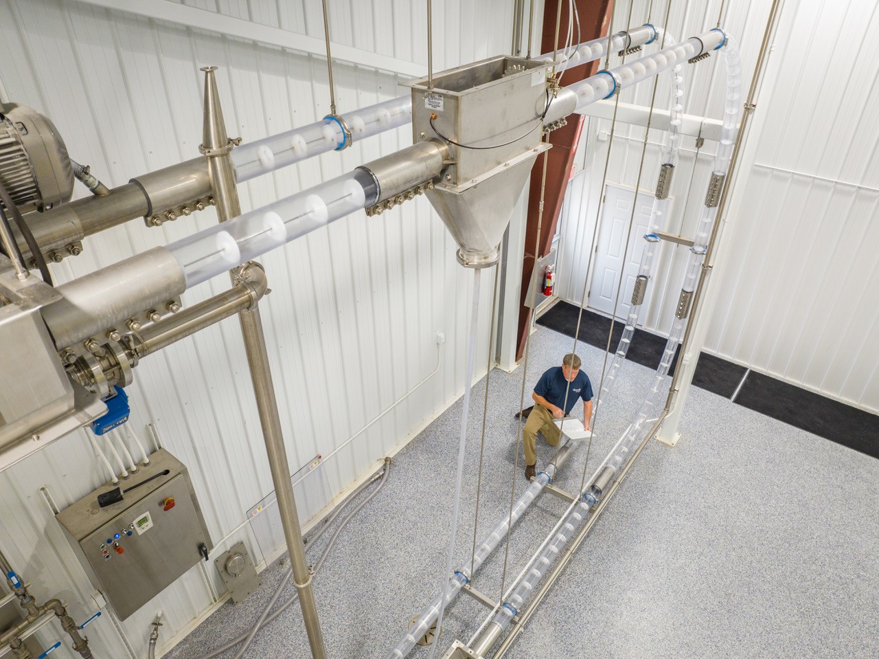 The test center also includes a spare parts and service hub, in addition to a powder lab, where customer materials can be evaluated before conducting bulk testing. Here, material characteristics such as bulk density, moisture content, and angle of repose can be identified to determine material flowability. The site is equipped with full dust extraction.