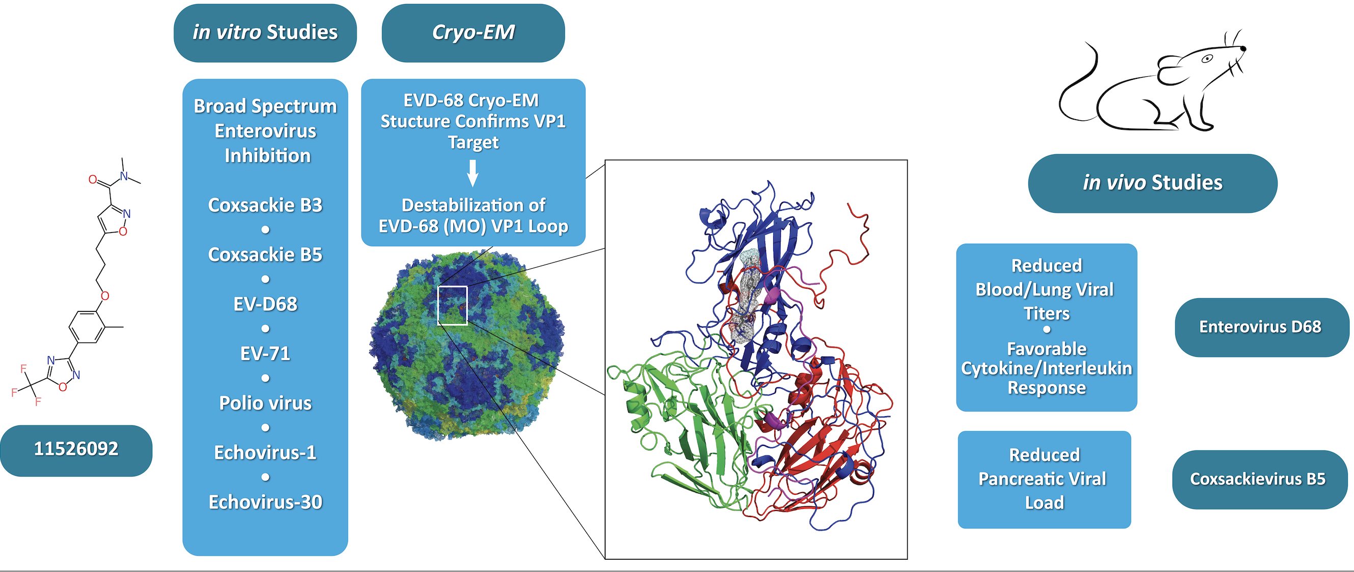 “We have previously developed several new pleconaril-based molecules which displayed potent in vitro activity against a panel of CVs and rhinoviruses. We have now discovered that one of these compounds, 3-(3-methyl-4-(3-(3-N,N-dimethylcarbamoyl-isoxazol-5-yl)propoxy)phenyl)-5-trifluoromethyl-1,2,4-oxadiazole (11526092) displays potent in vitro inhibition across various EVs. This molecule demonstrated promising antiviral activity against EV-D68 in a mouse respiratory model of EV-D68 infection. Cryo-electron microscopy (cryo-EM) was used to demonstrate that 11526092 binds to the EV-D68 VP1 from the MO strain. We have additionally determined that 11526092 inhibits CVB5 in vitro and in vivo, and therefore may represent a promising new lead compound” said CPI CEO Dr. Sean Ekins.