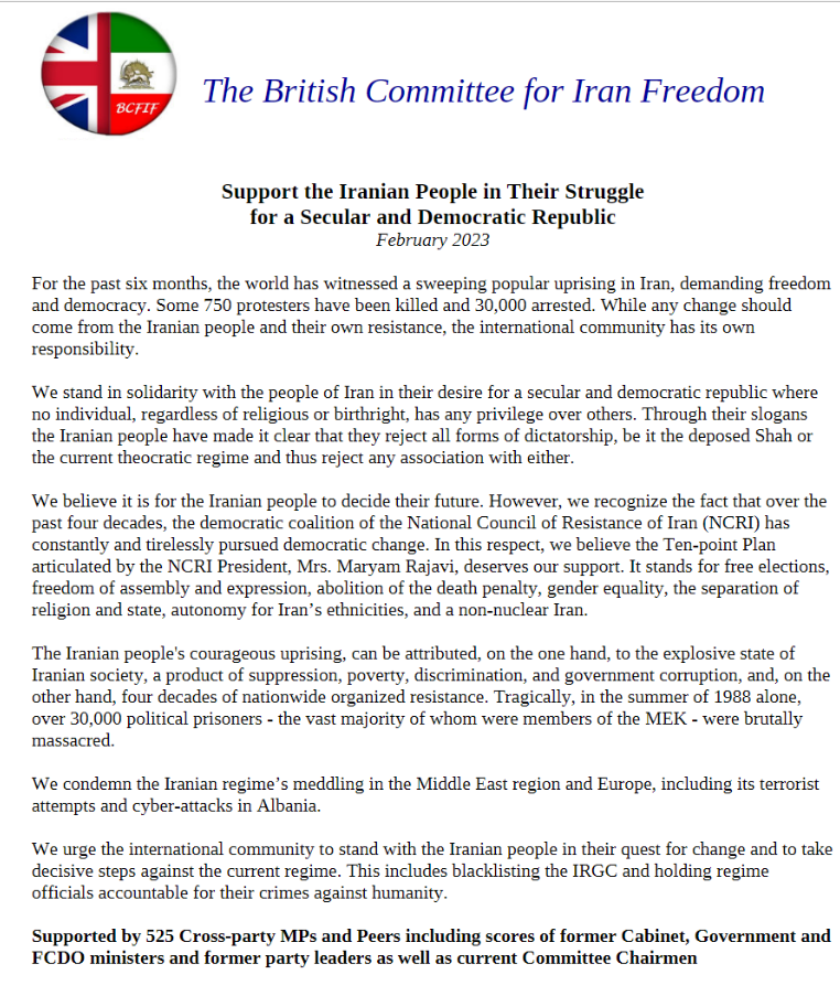 The National Council of Resistance of Iran ( NCRI) President-elect Mrs. Maryam Rajavi said: “Your statement clearly shows that the British people’s elected representatives stand with the people of Iran and support their uprising and Resistance for freedom. It also shows that you stand with the Iranian people who reject all forms of dictatorship either the Shah or the mullahs. You have been pioneers in advocating the correct policy. The people of Iran will always remember the significant role played by 36 members of both Houses of Parliament who bravely challenged the unjust blacklisting of the PMOI at the court, ultimately leading to the organization’s delisting. And now you are at the forefront of blacklisting the IRGC.”