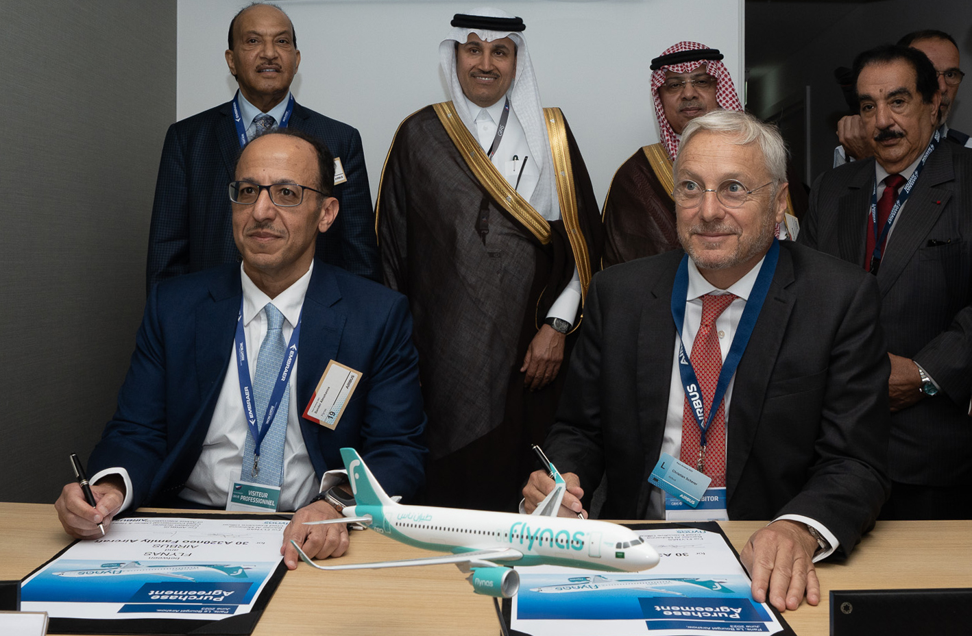 The agreement was signed at the Paris Airshow by Bandar Almohanna, flynas Chief Executive Officer & Managing Director, and Christian Scherer, Airbus Chief Commercial Officer & Head of International, in the presence of H.E. Saleh Al-Jasser, the minister of Transport and Logistic Services, Abdulaziz Alduailj, President of General Authority of Civil Aviation in Saudi Arabia, and Ayed Aljeaid, Chairman of the Board of NAS Holding.