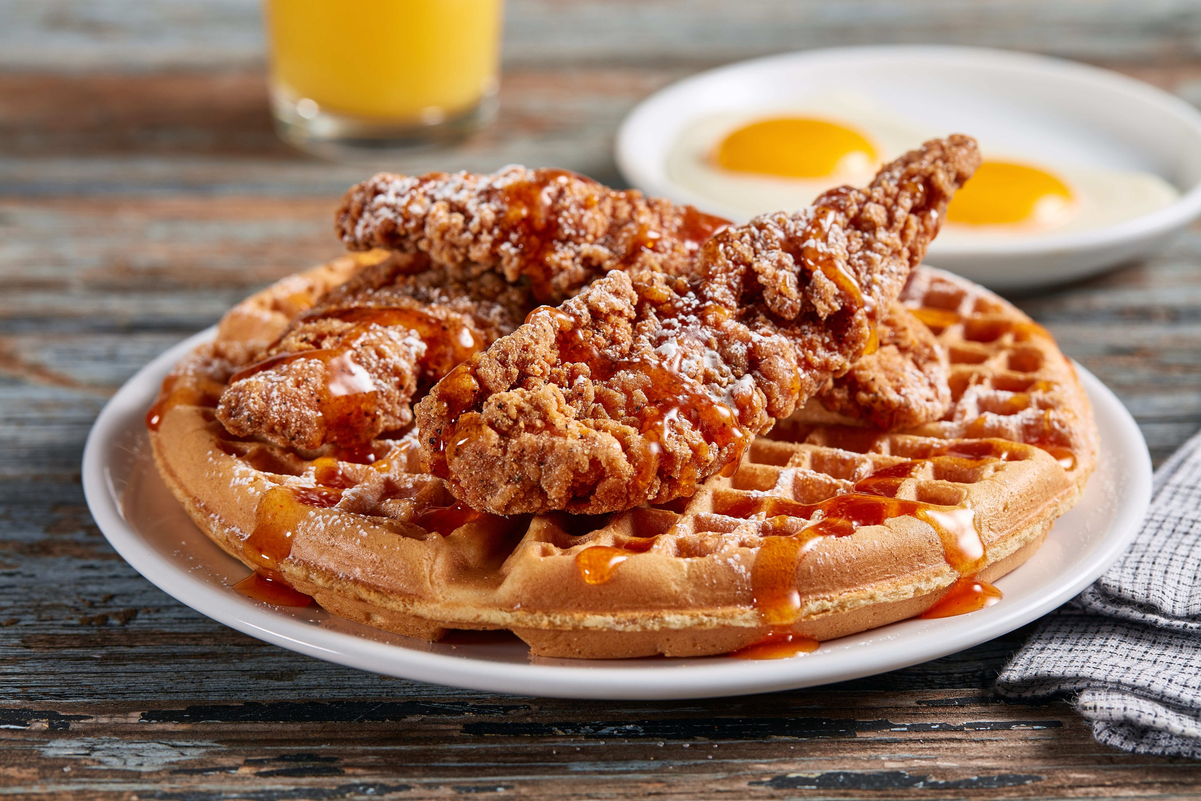 Hot Honey Chicken & Waffle: A freshly made golden waffle topped with three Huddle House crispy Southern fried chicken tenders, drizzled with Huddle House® Hot Honey sauce, and topped with powdered sugar. Served with two eggs (any style).