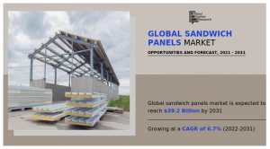 PORTLAND, UNITED STATES, UNITED STATES, June 21, 2023/EINPresswire.com/ -- Sandwich panels are a type of construction material that is used for building walls, roofs, and floors. They are composed of two layers of facing material, which are joined together with an insulation core. These panels are made from a variety of materials, including metals, plastics, and composites. The panels have the ability to provide excellent thermal and acoustic insulation and are widely used in the construction industry. The global sandwich panels market size was valued at $20.21 billion in 2021, and is projected to reach $39.16 billion by 2031, growing at a CAGR of 6.7% from 2022 to 2031.