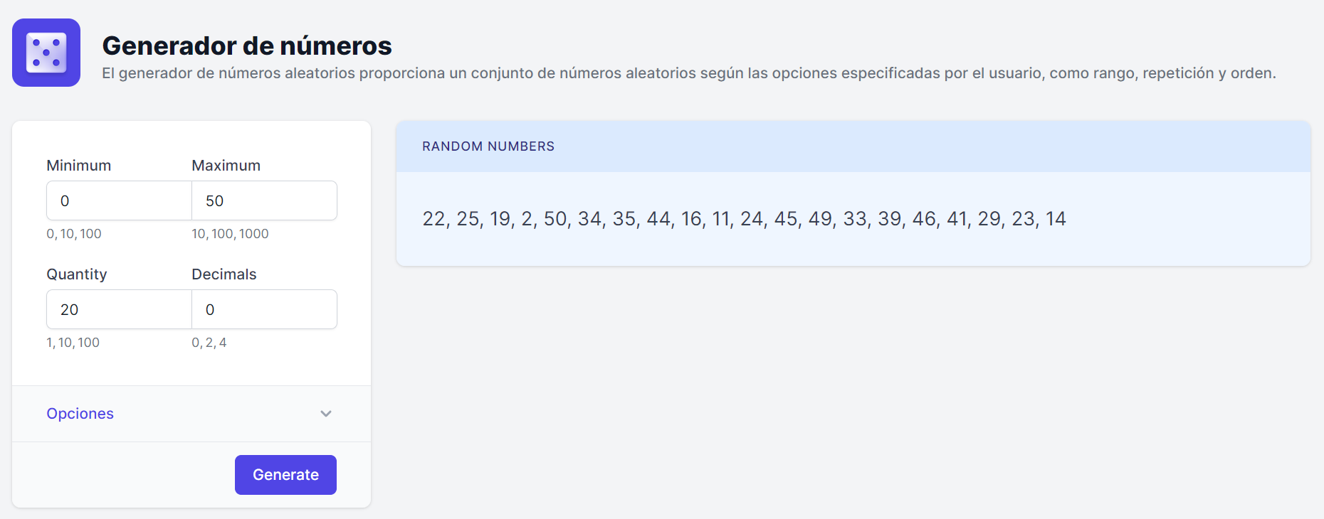 El Generador de números de Calculator.io no sólo es versátil, sino que también es increíblemente fácil de usar, manteniendo la filosofía de la empresa de proporcionar soluciones de cálculo en línea fiables y amigables para el usuario.