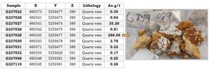 Table 1. Spring 2023 LGZ grab sampling* highlights (over 0.1 g/t Au)
