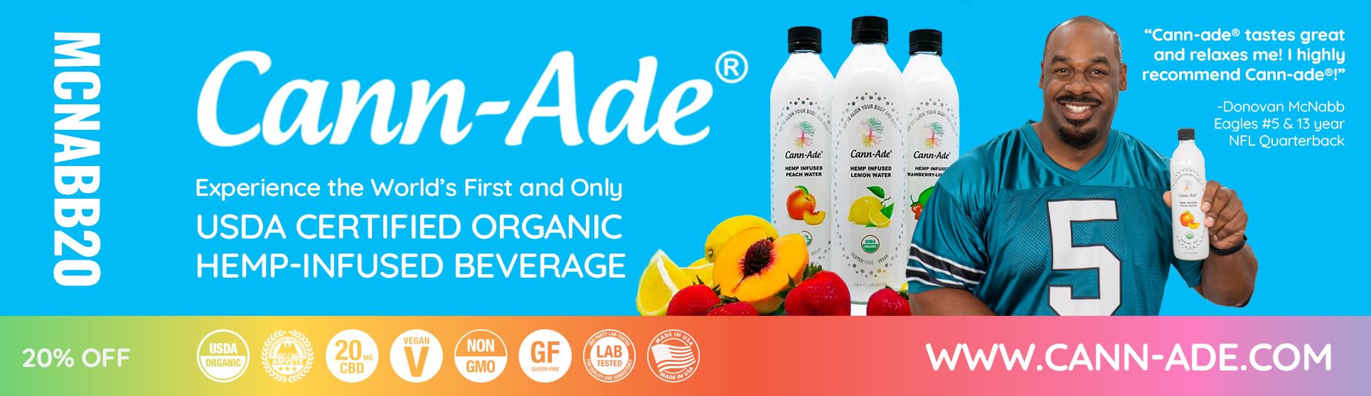 “We are thrilled to receive Donovan McNabb’s endorsement of Cann-Ade®,” said Benjamin Mogul, founder and CEO of Cann-Ade® Corporation. Mr. Mogul continued, “As a highly respected professional athlete and health advocate, Donovan's endorsement of Cann-Ade® further validates our commitment to providing the best quality hemp-infused beverage in the market with our goal to naturally help consumers with their total body wellness.”