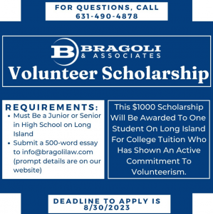 Qualified and interested candidates may apply for the volunteer scholarship by submitting a 500-word essay to info@bragolilaw.com. The essay must detail their experience, sharing the organization they volunteer for, what inspired them to volunteer, and how their efforts better the community. Deadline to apply is August 30, 2023. To learn more about the Bragoli & Associates Scholarship 2023, visit https://www.bragolilaw.com/