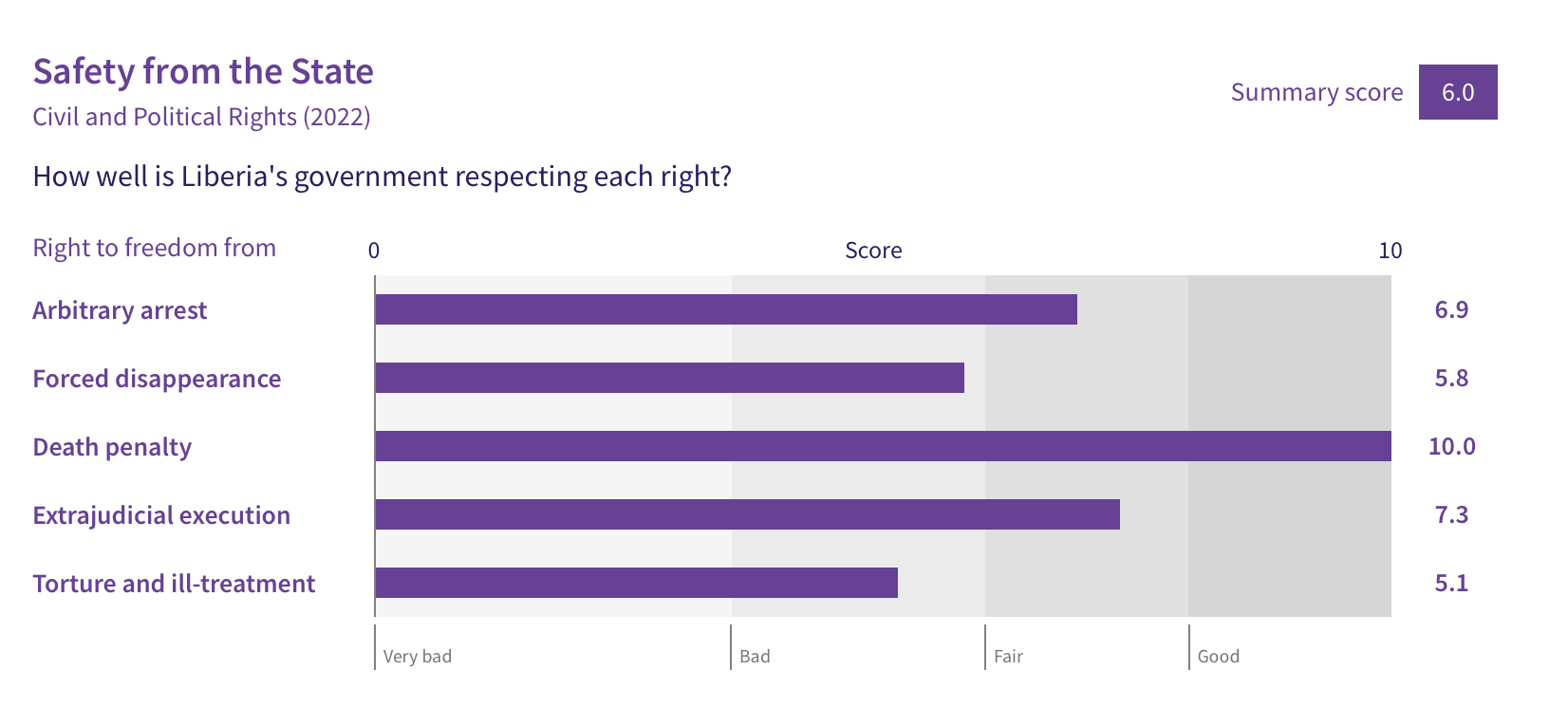 Liberia’s score of 6.0 out of 10 on physical integrity rights suggests that many people in Liberia are not safe from the state. There are no signs of improvement in the Liberian government’s performance to protect people from state violence.