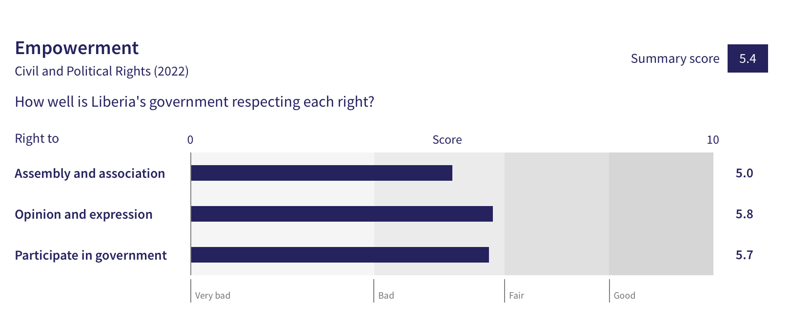 Liberia scores 5.4 out of 10 on empowerment rights, suggesting that many people are not enjoying their civil liberties and political freedoms. All three of the government’s empowerment rights scores fall in the ‘bad’ range. There is much room for improvement in order to fulfil the obligations set out in international law.