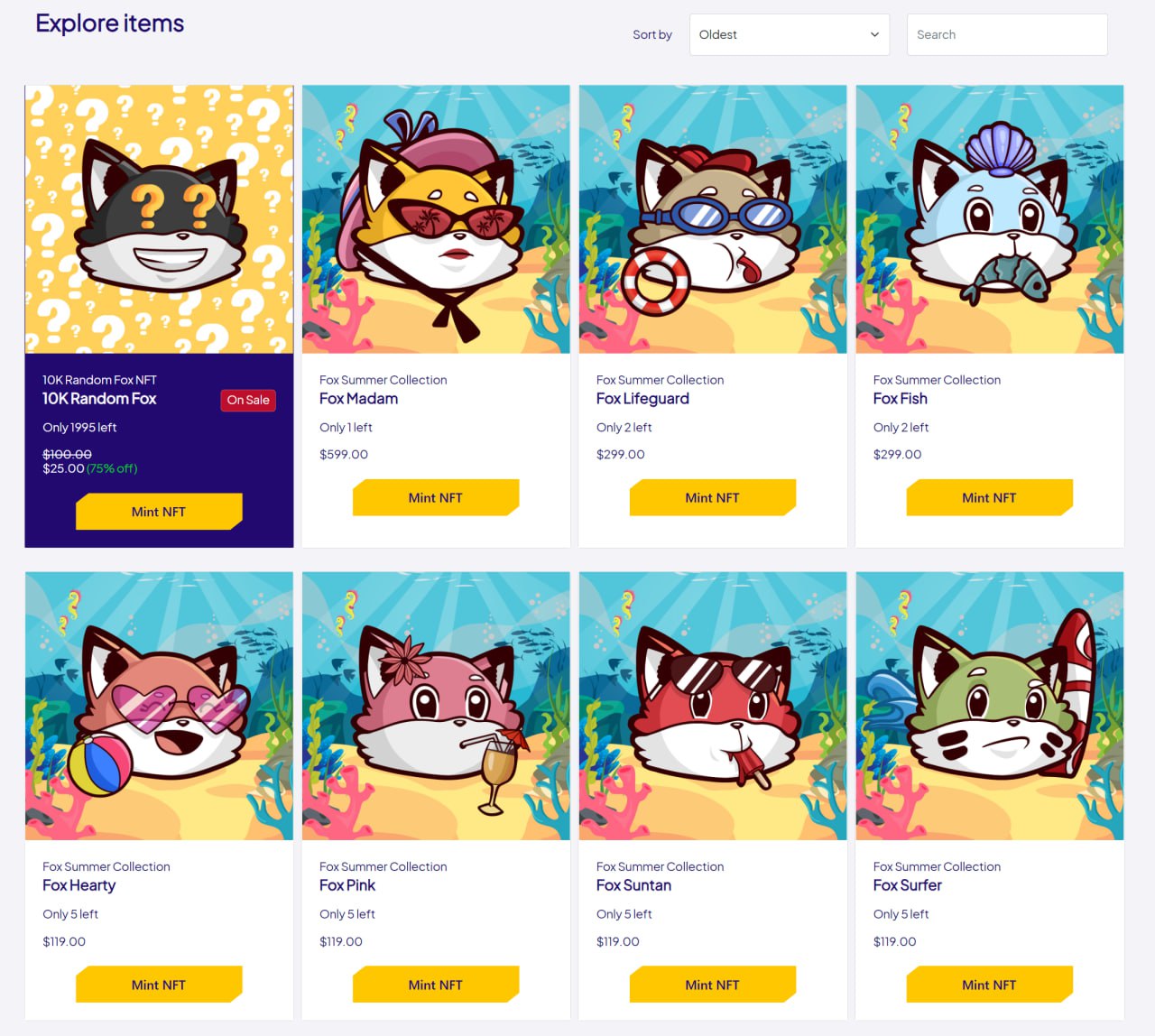 The marketplace comes with a shop where you can mint the NFTs that are for sale. The sales page where you can sell your NFT at a fixed price, and finally the auction page where you can put your NFT up for auction.