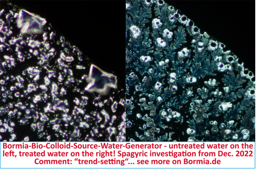 OWINGEN, GERMANY, July 5, 2023/EINPresswire.com/ -- Bormia.de is a 'trend-setting' and growth-oriented German R&D company in the field of water treatment at Lake Constance. It deals with BIONIK, an exclusively nature-conform water treatment and clearly differs from its competitors in all approaches. Vital water is the new keyword, which developer Nadeen Althoff sums up in terms of content by "structure generates stability". Leaping sustainability in food production, doubling the shelf life of food & beverages produced and processed with Bormia and a significant cost reduction, are weighty arguments in the current time. The bionic water treatment at Bormia.de is underpinned by powerless application, freedom from maintenance and without collateral damage to the product - a significant 'trendsetting' innovation.Bormia.de as th only bionic watertreatement has obtained the 3rd and 4th certification to reduce best bevor food problems for food the entire food industry. Certifications in water treatment clarify the question "What is good for the product and subsequently for the human body"? Bormia.de, as a provider of a natural water treatment process and electro less colloid homogenizer, extends its scientific lead again with 2 more certifications. Two further meaningful scientifically reproducible test methods for the question "What causes vitality in water?". So far, cell biology (bio-availability and reaction of the body cells) and bio-physics (effect on the entire glandular system) were already trendsetting for natural water treatment. Bormia extends its scientific certifications by the traditional method of Spagyrik and by scientific realizations in the current book of Professor Gerald Pollack (the USA) "water is more than H²O" page 108. The investigation of the Spagyrik was commented with the abbreviation: "Trendsetting"! It shows pictures with "high-lively" structuring (see pic). In the book of Prof. Pollack, a world-known water scientist was a 1:1 correspondence (match). On the question of "maximum energy input in drinking water" Prof. G. Pollack measures a "3,000 nm nanometre wavelength - a deep infrared". This quantity was measured in a 2006 quality study at Bormia.de - which at that time was merely a handmade water treatment system (test device).
