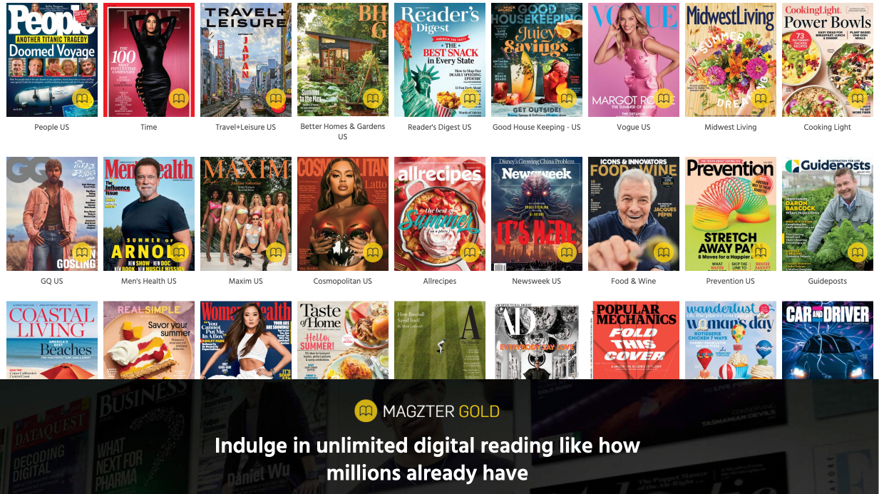 NEW YORK, NEW YORK, USA, July 3, 2023/EINPresswire.com/ -- Magzter Inc., the world's largest digital newsstand, is thrilled to announce the significant growth of its premium titles in the US region under its Magzter GOLD program. This expansion further solidifies Magzter's position as a leading platform for digital magazines and newspapers, providing readers in the US with an extensive collection of high-quality publications.As part of its commitment to delivering exceptional content to users, Magzter Inc. has strategically expanded its portfolio of premium titles available to readers in the US. The expansion encompasses publisher partnerships that strengthen Magzter's presence in the US market. Notably, Magzter has successfully collaborated with renowned magazine publishers, including Hearst, Condé Nast, TIME USA, LLC, and Dotdash Meredith, among others. This concerted effort enhances Magzter's already vast catalog and enriches its Magzter GOLD subscription program.