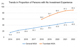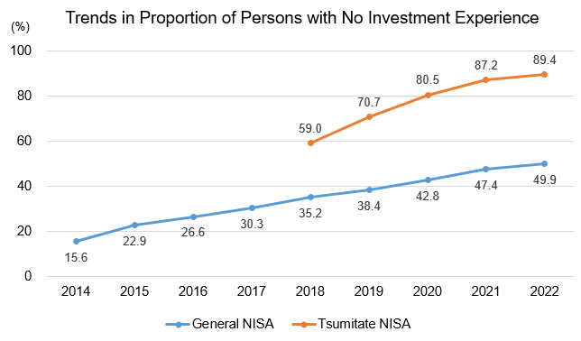 Launched in 2014, NISA is a system designed to encourage even novice investors to easily manage their assets. According to the Japan Securities Dealers Association (JSDA), 49.9% of those who have opened "General NISA" accounts, which allow investment in stocks, had no prior investment experience (as of the end of December 2022). With gradual growth in awareness of NISA, the proportion of novice investors among those who have opened accounts in recent years has been increasing.