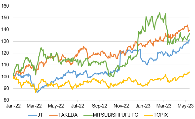 "High dividend yield" is a keyword common to these stocks. Compared to the TSE Prime Market's weighted average yield of 2.33% (as of April), the yields of JT, Takeda, and Mitsubishi UFJ were far above the average, at 6.17%, 4.21%, and 4.41%, respectively, as of May 17.