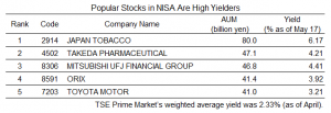 QUICK compiles a ranking of NISA accounts at online securities companies in terms of assets under management at the end of each month. As of the end of March, Japan Tobacco (JT, 2914) ranked first with JPY80 bn, followed by Takeda Pharmaceutical (Takeda, 4502) with JPY47.1 bn and Mitsubishi UFJ Financial Group (Mitsubishi UFJ FG, 8306) with JPY46.8 bn.
