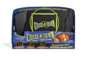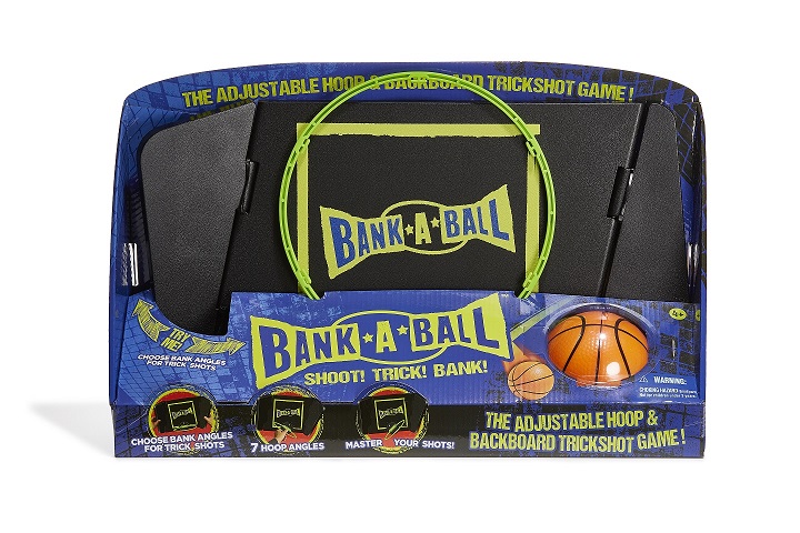 Bank-A-Ball ($44.99 for ages 4+) is the new adjustable angle basketball backboard and rim that hooks atop a standard-sized door to turn any room into an indoor trick shot playground.
