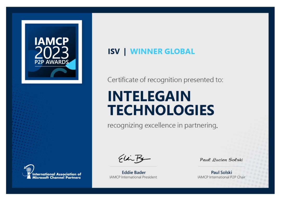 DALLAS, TX, UNITED STATES, July 10, 2023/EINPresswire.com/ -- Intelegain Technologies, a leading global software solutions provider, is pleased to announce its remarkable achievement at the prestigious IAMCP GLOBAL P2P Awards 2023. The IAMCP Awards are instituted by the International Association of Microsoft Channel Partners (IAMCP), a global association of Microsoft Partners.The company has been honoured as a Winner in “Global and “Asia Pacific” regions in the Independent Software Vendor (ISV) category. This recognition serves as a testament to Intelegain's unwavering commitment to innovation, excellence, and customer satisfaction.