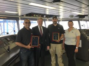 Joe Cruise, Chief Executive Officer of GT USA Wilmington, joined Captain Christopher Cruz, along with Dennis Ryan, Sr. Manager – Operations and Grace Suhovsky, Port Captain – US Mid-Atlantic Region of Liberty Global Logistics (LGL), on board to welcome the vessel and present the Captain and LGL with plaques to mark the maiden call. “We are delighted to welcome the m/v Liberty Power to the Port of Wilmington. It is a privilege to continue to work with Liberty on these important projects.” said Cruise.