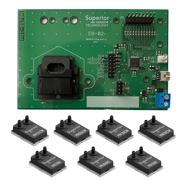 The VN Series EV Kit includes all of the VN Series pressure sensors (VN025CM, VN026CM, VN130CM, VN131CM, VN150D, VN150A and VN-BARO) along with the evaluation board and a USB drive with software and documentation.