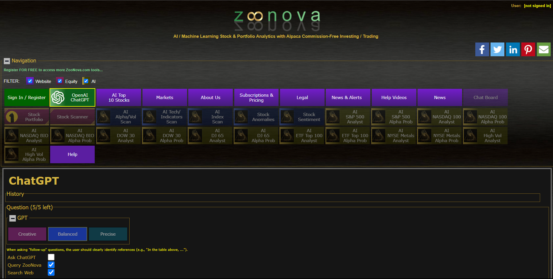 Zoonova.com is the first financial web application to offer ChatGPT-4 with Internet Search and AI/Machine Learning-based Stock/ETF data for free.