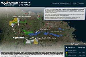VANCOUVER, British Columbia, July 17, 2023 (GLOBE NEWSWIRE) -- MAX Power Mining Corp. (CSE: MAXX; OTC: MAXXF; FSE: 89N) (“MAX Power” or the “Company”) has become a leading landowner in the emerging Raglan Lithium District, Northern Quebec, with the acquisition of 802 claims or 336 sq. km at Raglan South beginning approximately 10 km south of KoBold Metals’ large battery metals project.